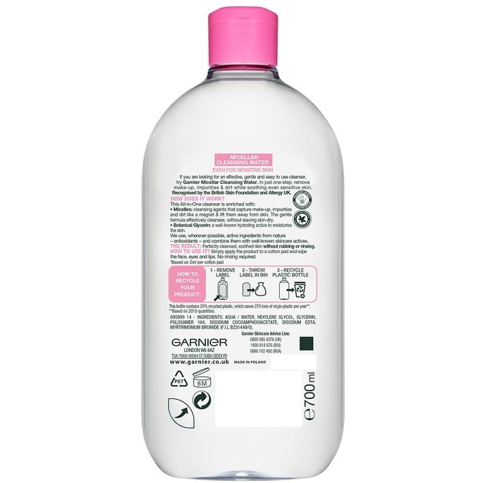 Looking for an effective, gentle and hydrating way of removing make-up and cleansing skin in one easy step? Garnier Micellar cleansing waters gently remove up to 100% of make-up, dirt, and pollution from the skin. Skin is left free of impurities, revealing skin so healthy it glows. The gentle cleansing formulas glide over skin and effectively remove make-up without the need to rub or strain delicate sensitive skin. Garnier Micellar Waters are suitable for all sensitive skin types. Soothing and fragrance-free formula makes it suitable for even more sensitive skin