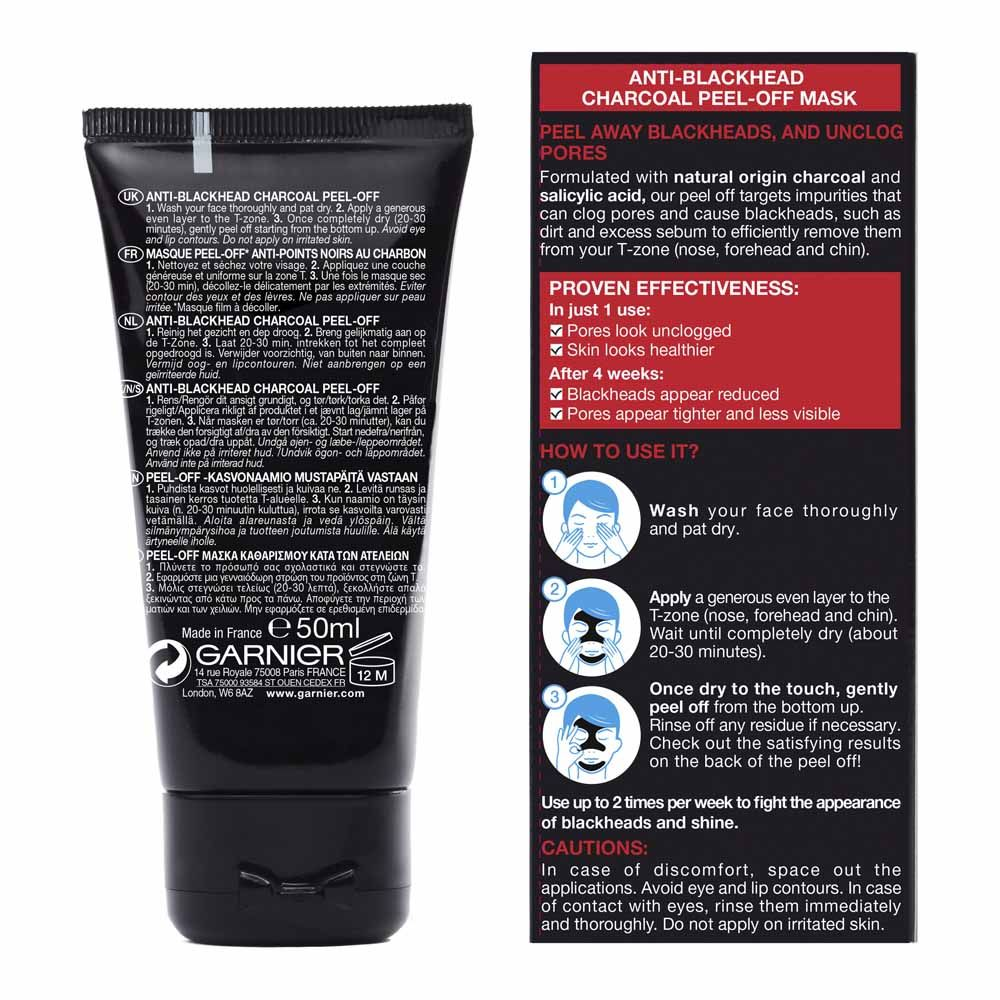 At Garnier we know that the Pure Active Charcoal Anti Blackhead Peel-Off Mask is an effective way to remove blackheads from your T-Zone (nose, chin and forehead). Our formula contains salicylic acid and charcoal which are at the forefront of skincare technology, scientifically proven to remove impurities and unclog pores giving you an incredible facial cleanse. Our peel off mask acts like a magnet for dirt to help purify the skin, visibly tightening pores and controlling the appearance of sebum. Features:Formulated with natural origin ingredient extracts of charcoal and salicylic acid Targets impurities that can clog your pores, such as dirt and excess sebum.