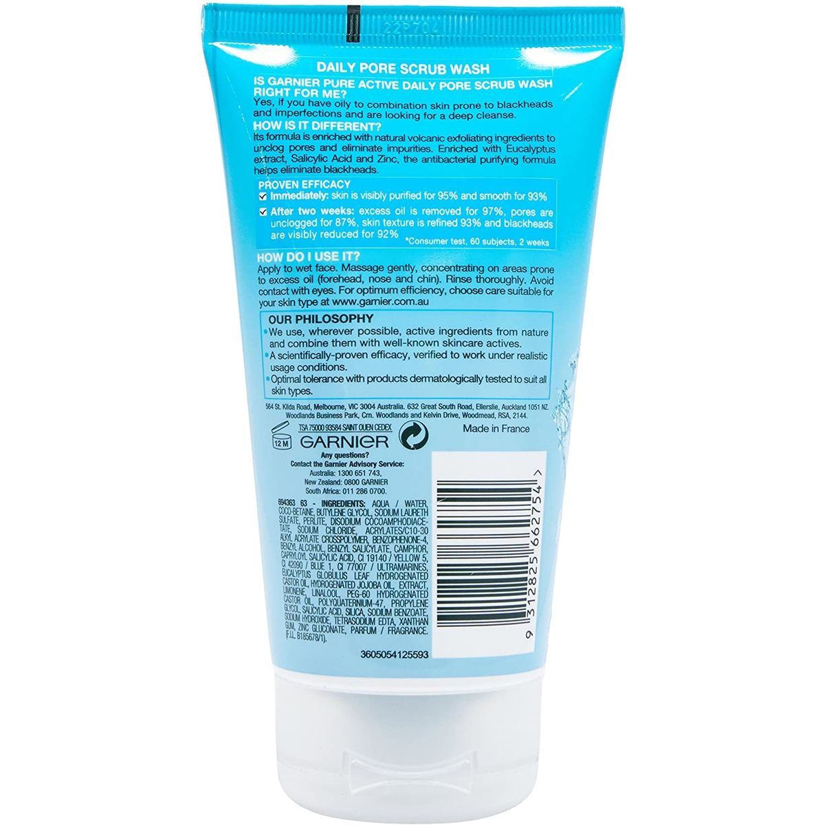 Garnier Pure Active Daily Pore Scrub Wash provides a deep cleanse, and unclogs pores and eliminates impurities for oily skin prone to imperfections. How is it different? Its formula is enriched with Eucalyptus extract, Salicylic Acid and Zinc. Its antibacterial, purifying formula helps eliminate blackheads.